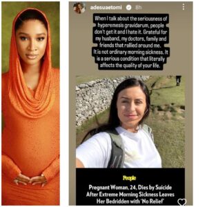 Adesua recalled her experience while reacting to a report about a pregnant UK woman who d!ed by su.!cide after extreme morning sickness left her bedridden.
