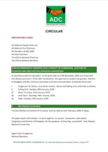 African Democratic Congress (ADC)  is set to conduct a congress in Abuja, aiming to elect delegates and non-elective convention members. This marks a crucial step in the party’s efforts to strengthen its internal democracy and prepare for future elections.