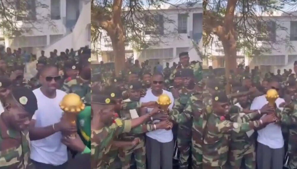 In a clip circulating on the microblogging platform, X (formerly Twitter), a young man with glasses is seen holding the AFCON trophy surrounded by military personnel.