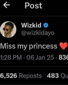 Wizkid’s tweet, which read “I miss you princess,” has left fans and colleagues wondering about the identity of the “princess” and the latest development in his personal life.