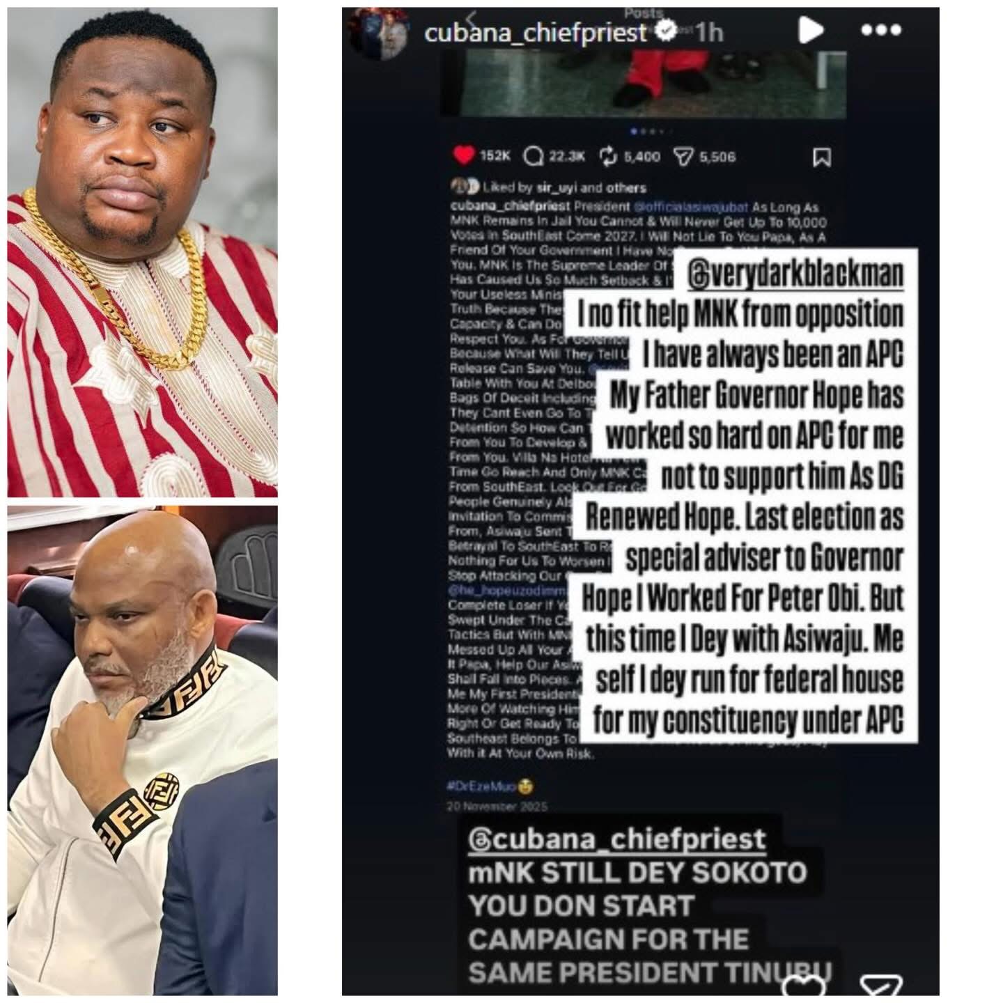 Reacting to VDM’s callout, ChiefPriest in a post shared on his Instastories, said that he cannot help Nnamdi Kanu if he remains in the opposition, He said he has always been an APC member and that despite the fact that he is an APC member, he campaigned for Peter Obi during the 2023 general election. He said with regards to the 2027 elections, he will work towards President Tinubu’s re-election. He also mentioned he will be seeking to run for a seat in the House of Representatives.
