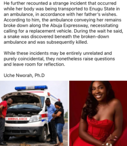 He further recounted a strange incident that occurred while her body was being transported to Enugu State in an ambulance, in accordance with her father’s wishes. According to him, the ambulance conveying her remains broke down along the Abuja Expressway, necessitating calling for a replacement vehicle. During the wait he said, a snake was discovered beneath the broken-down ambulance and was subsequently killed.