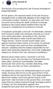 He stated that contrary to widespread reports on social media, Ifunanya did not live on the ground floor of her residence but on the second floor. This raises questions about how snakes could have gained access to her apartment. Had she lived on the ground floor, one might argue that the snakes entered through drainage systems or toilets, but this explanation appears less straightforward given that she lived on the second floor.