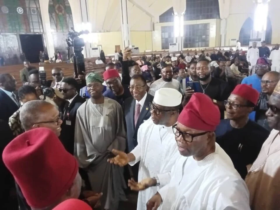 Former Anambra Governor, Peter Obi exchanging pleasantries with Senate President Senator Godswill Akpabio and some other notable lawmakers at the Service of Songs held in memory of Late Senator Okey Ezea in Abuja... Photo Credit: Adebayo Folorunsho-Francis