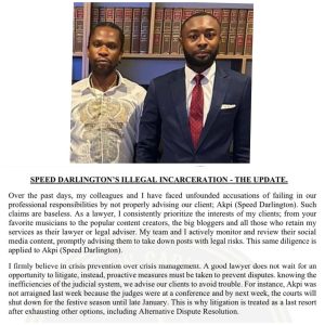 Akpi was not arraigned last week because the judges were at a conference and by next week, the courts will shut down for the festive season until late January. His matter has now been fully charged to court- Speed Darlington’s other lawyer, Stan Alieke, gives update