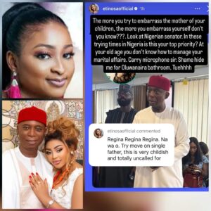 In a series of posts shared on her Instagram Stories, Etinosa criticised the lawmaker for repeatedly bringing Regina into public conversations, especially during a period when the country is dealing with serious issues.