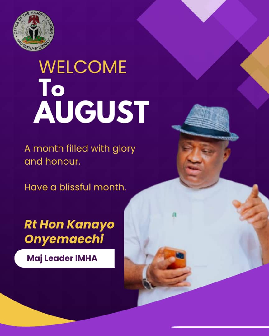 As the month of August 2025 begins, the Majority Leader of the Imo State House of Assembly and Member representing Owerri West State Constituency, Rt. Hon. Chief Kanayo Onyemaechi (Dele—Egbe Eji Eje Ogu), has extended a heartfelt message of renewed hope, peace, and divine blessings to the good people of Imo State, particularly his constituents in Owerri West.