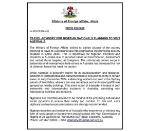 The reciprocal advisories reflect growing tensions and concerns over security and cultural dynamics in both nations. While Australia is known for its multiculturalism, the Nigerian government’s statement emphasized recent challenges in tolerance, advising citizens to remain cautious and mindful of their surroundings.