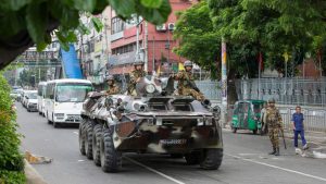 Soldiers on armoured vehicle patrolling Dhaka last month. Pic: AP