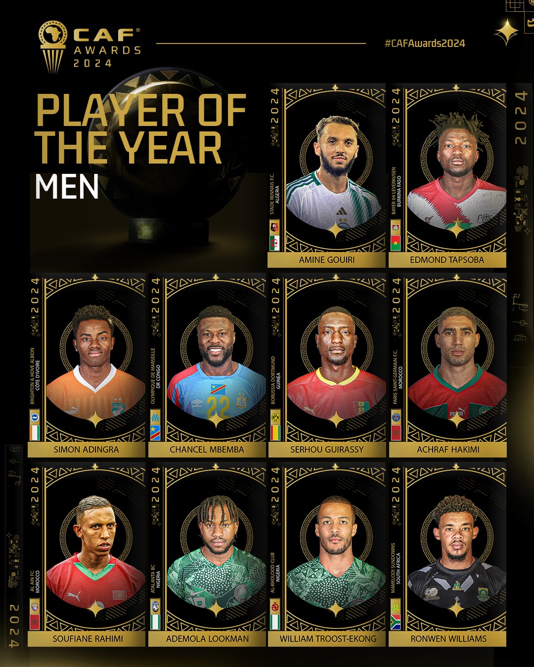 The Confederation of African Football has unveiled its much-anticipated shortlist for the 2024 Men’s Player of the Year award, featuring Nigerian talents Ademola Lookman and William Troost-Ekong among the distinguished nominees.