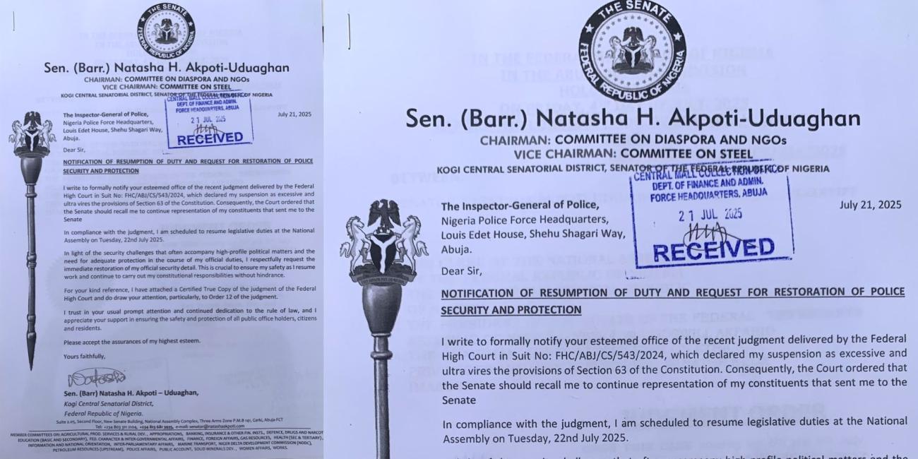 Senator Natasha Akpoti-Uduaghan has formally notified the Inspector-General of Police, Kayode Egbetokun, of her scheduled return to the National Assembly on Tuesday, July 22, 2025, following a recent Federal High Court ruling that overturned her suspension from the Senate.