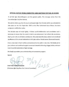 The highly anticipated Igbo Yam Festival, scheduled to take place in Ghana, has been officially postponed. According to an announcement from the office of Eze Igbo Ghana, a new date will be announced soon.