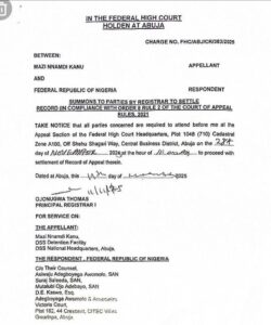The Federal High Court in Abuja has issued a summons for Mazi Nnamdi Kanu, leader of the Indigenous People of Biafra (IPOB), to appear on November 28, 2025. The hearing aims to settle records related to an appeal he filed before the court’s November 20 judgment, which sentenced him to life imprisonment on terrorism charges.