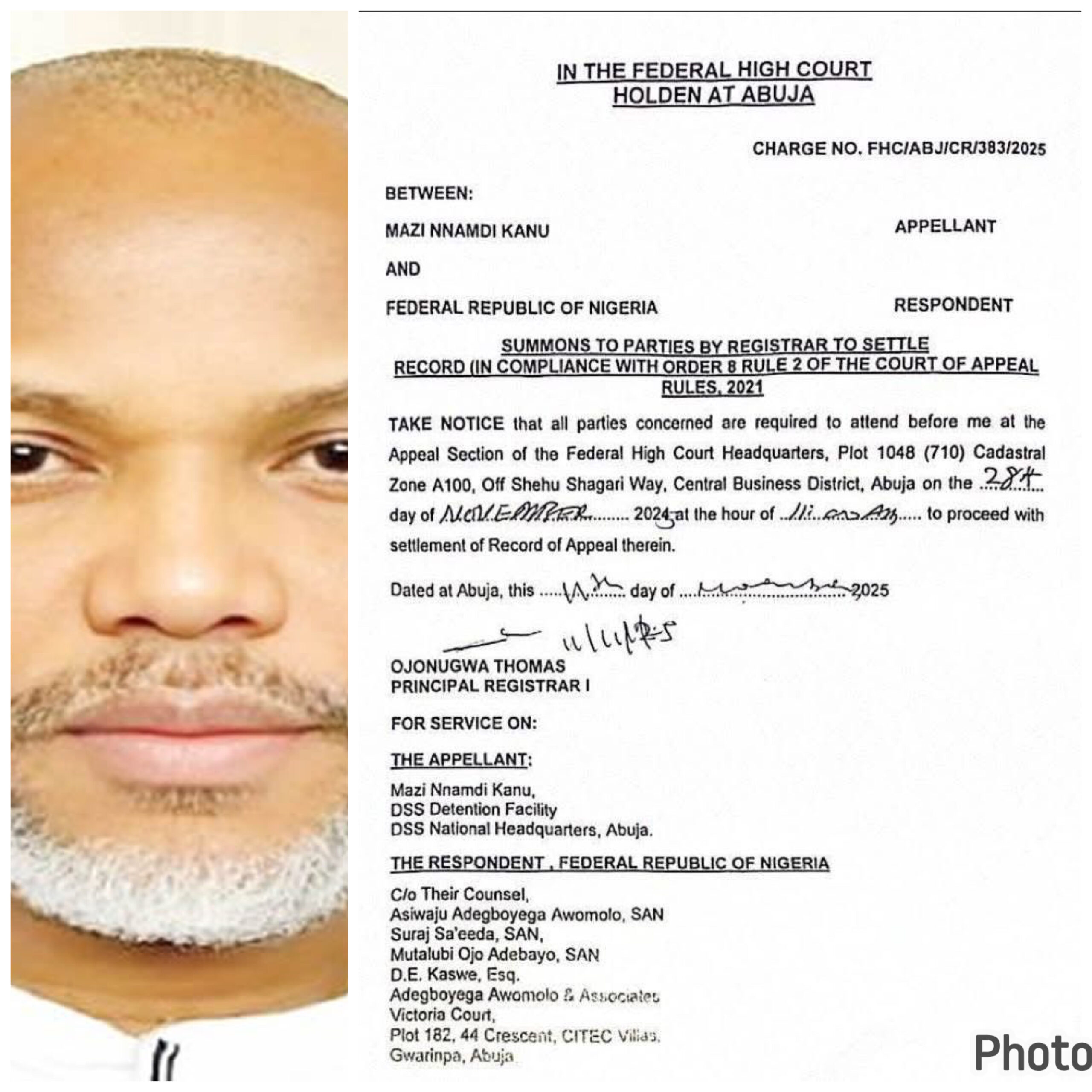 The Federal High Court in Abuja has issued a summons for Mazi Nnamdi Kanu, leader of the Indigenous People of Biafra (IPOB), to appear on November 28, 2025. The hearing aims to settle records related to an appeal he filed before the court’s November 20 judgment, which sentenced him to life imprisonment on terrorism charges.