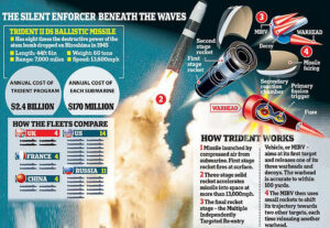 The UK has its own nuclear warheads but fits them to American made and maintained Trident ballistic missiles carried in the Royal Navy’s Vanguard Class submarines.