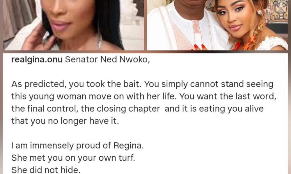 Actress Gina Onuoha has strongly responded to Senator Ned Nwoko following his reaction to the drug test Regina Daniels reportedly took abroad. In a lengthy...
