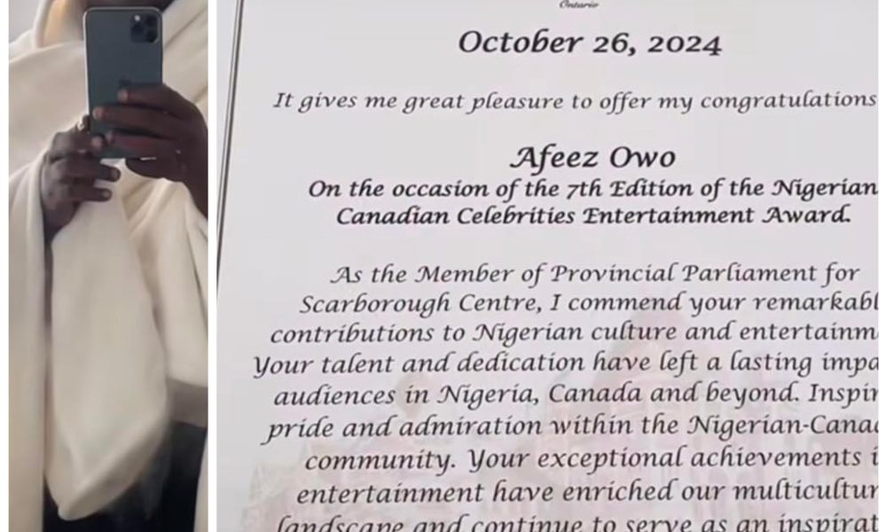 Renowned Nigerian actor, Afeez Owo, has achieved international recognition, receiving a prestigious award and certification in Canada. Afeez Owo took to Instagram to share the...