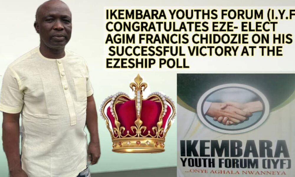 The Ikembara Youths Forum (I.Y.F) joyfully congratulates Eze-Elect Agim Francis Chidozie on his resounding victory at the just concluded Ezeship poll held on Saturday, 20th...
