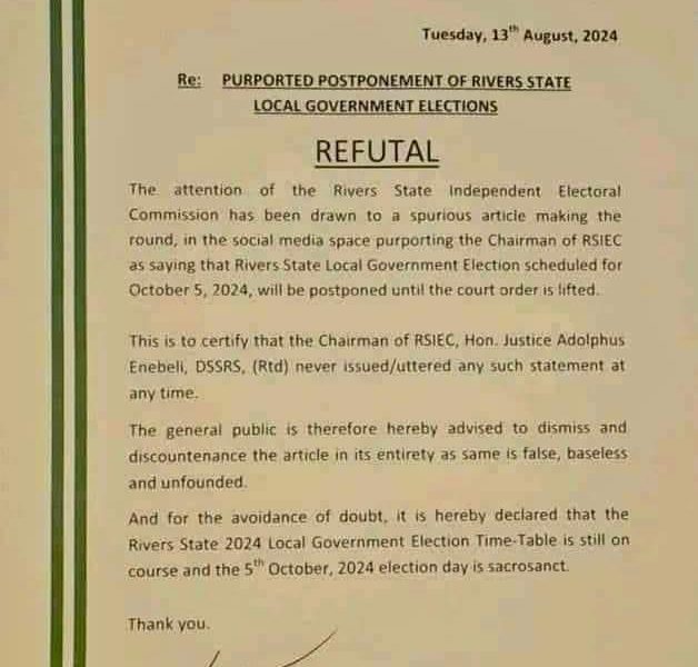 Re: PURPORTED POSTPONEMENT OF RIVERS STATE LOCAL GOVERNMENT ELECTIONS REFUTAL The attention of the Rivers State Independent Electoral Commission has been drawn to a spurious...