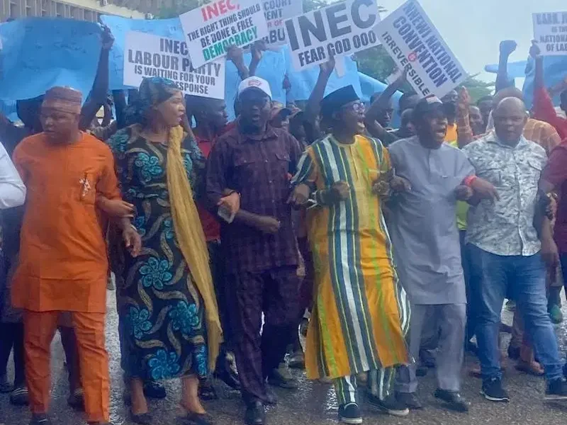 Civil society organisations sympathetic to the Julius Abure-led faction of the Labour Party (LP) have stormed the National Headquarters of the Independent National Electoral Commission (INEC)...