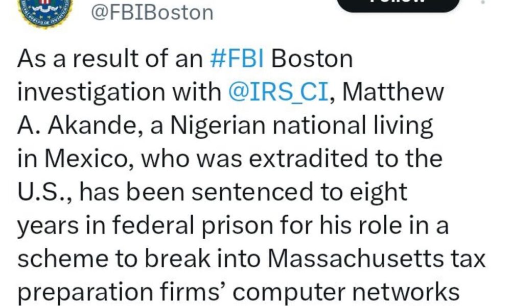 A Nigerian national living in Mexico, Mathew . A. Akande, who was extradited to the United States, has been sentenced in federal court in Boston...