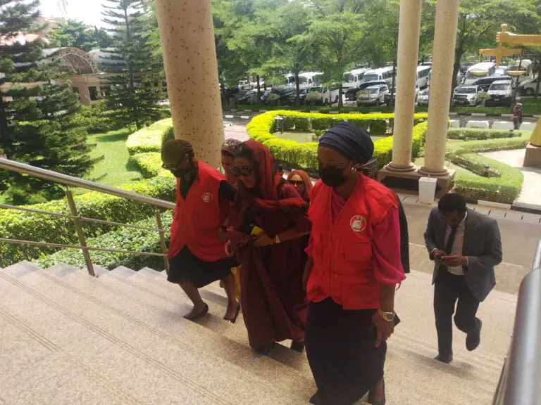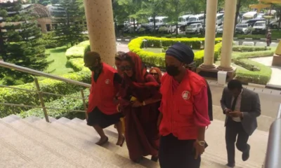 Operatives of the Economic d Financial Crimes Commission, EFCC, on Wednesday, arrived at the Federal High Court in Abuja with the businesswoman, Aisha Achimugu, as ordered...