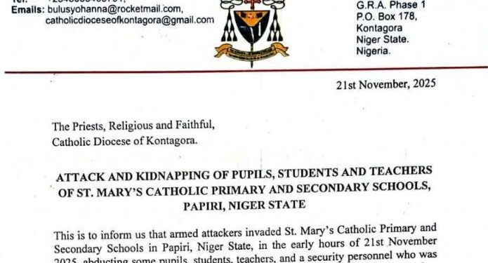 The Catholic Diocese of Kontagora has confirmed that armed assailants attacked St. Mary’s Catholic Primary and Secondary Schools in Papiri, Niger State, in the early...