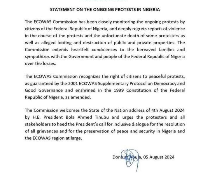 The Economic Community of West African States (ECOWAS) has released a statement regarding the ongoing #EndBadGovernance protest in Nigeria. The statement includes: Condemnation of violence:...