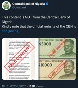 The Central Bank of Nigeria (CBN) has dismissed as false a circulating report claiming that it has introduced new N5,000 and N10,000 banknotes to enhance cash transactions.