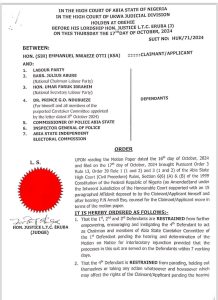 The Court also restrained the Abia State Independent Electoral Commission(ABSIEC) , the Inspector General of Police from dealing with Dr Ndubueze pending the determination of the Suit.