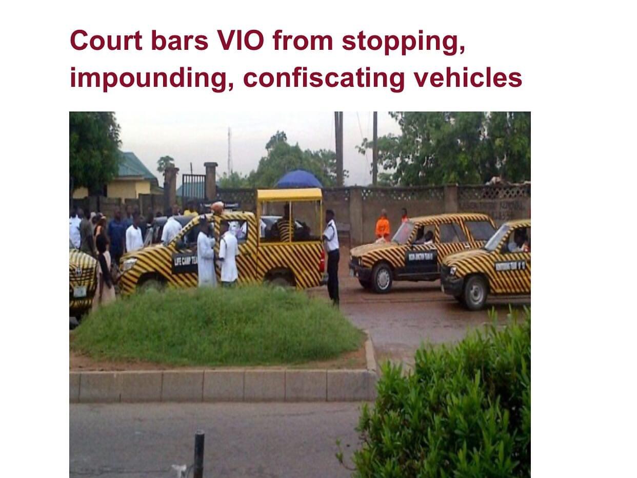 The Directorate of Road Traffic Services also known as VIO has been barred by a Federal High Court in Abuja from further stopping vehicles on the road, impounding or confiscating vehicles, and imposing fines on motorists.