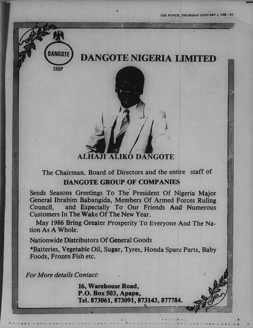 This newspaper advertisement, published on January 2, 1986, features Alhaji Aliko Dangote and the staff of the Dangote Group of Companies sending New Year greetings to both the President of Nigeria and their customers.