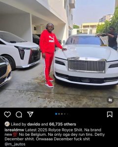 The musician’s logistics manager, Isreal DMW, shared snapshots of Davido’s sleek 2025 Rolls-Royce as it arrived in Lagos. Isreal’s excitement was palpable as he showcased moments of Davido taking his new set of wheels for a spin.
