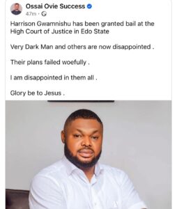 In a dramatic turn of events, the Edo State High Court has granted bail to activist Harrison Gwamnishu, who was arrested and detained following allegations of diverting N5.4 million from a N20 million ransom meant for an abducted Edo couple. The court, presided over by Justice E. O. Erhire, had previously denied Gwamnishu’s bail application on December 9, 2025, citing the need for further inquiry into the allegations against him.