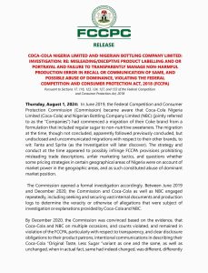 FCCPC have accuse Coca Cola Nigeria of misleading trade description and unfair marketing tactics.