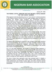 “What appears to be the disturbing return of “one chance” criminal operations in the Federal Capital Territory has once again plunged Abuja into grief. In separate but equally tragic incidents, Ms. Chinemerem Pascalina Chuwumeziem, a nurse, and Princess Chigbo Mediatrix, our dear colleague, a lawyer and former Treasurer of the Nigerian Bar Association Abuja Branch, lost their lives after falling victim to this deadly criminal enterprise. Their bodies were later discovered in different locations across the city. These were not faceless victims. They were professionals, contributors to society, and ordinary citizens whose only intention was to return safely from their daily engagements. Their deaths underscore a frightening reality that insecurity is once again tightening its grip on the nation’s capital.
