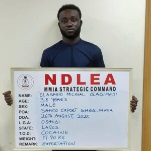 A statement released today November 7 by NDLEA spokesperson, Femi Babafemi, says the trio of Olasupo Michael Oladimeji; Muaezee Ademola Ogunbiyi; and Sola Adegoke who are leaders of one of the cartels were arrested following the seizure of 17.9 kilograms of cocaine concealed in textile materials and local charms going to Sydney, Australia at the export shed of the MMIA Lagos on 26th August 2025.