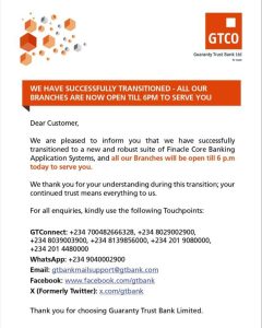 Guaranty Trust Bank (GTBank) has announced that it “successfully transitioned” to a new and advanced Finacle Core Banking Application System.