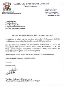 The statement signed by the Chancellor/Secretary of the diocese, Very Rev. Fr. Princewill Iwuanyanwu, “I am directed to inform you that one of our priests, Rev. Fr. Emmanuel Azubuike, was kidnapped this evening, Tuesday, November 5, 2024, at about 6pm.