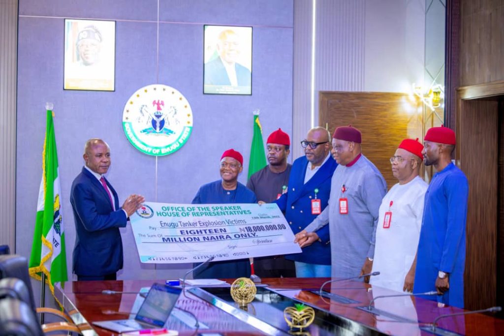 The Speaker, House of Representatives, Hon. Tajudeen Abbas, Tuesday, presented a cheque for N18 million to the Enugu State Government as support to the victims of the January 25 petrol tanker explosion at Ugwu Onyeama on the Enugu-Onitsha Expressway, which claimed several lives.