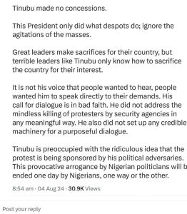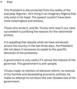 Human rights lawyer Inibeye Effiong reacts to President Tinubu’s speech this morning 4th August 2024 addressing protesters #endbadgovernanceinnigeria