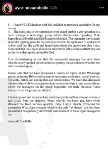“I have never had sex with Mr. Jedidiah or proposed sex to him for any reason. The questions in the screenshot were asked during a conversation in a male teenagers WhatsApp group where discussions regarding Male Reproductive Health and Self Esteem took place.