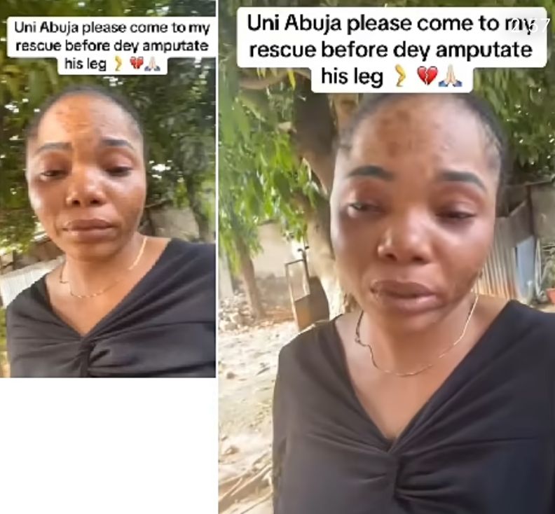 Lady cries out after her brother was knocked down by keke on his way to early morning test at UniAbuja, faces possible leg amputation