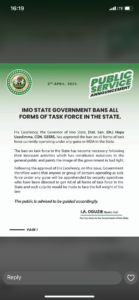 Following the approval of His Excellency, on this issue, Government therefore warns that anyone or group of persons operating as task force under any guise will be apprehended by security operatives who have been directed to get rid of all forms of task force in the State and such culprits would be made to face the full weight of Law.