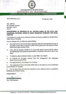 In a letter dated February 5, 2025, signed by the Honourable Commissioner for Transport, Emeka Okoronkwo, the government disclosed that the decision was directed by the Executive Governor of Imo State, Senator Hope Uzodimma. Chief Udeh was instructed to hand over all union properties to the newly appointed chairman, Hon. Jeff Eze, with immediate effect.