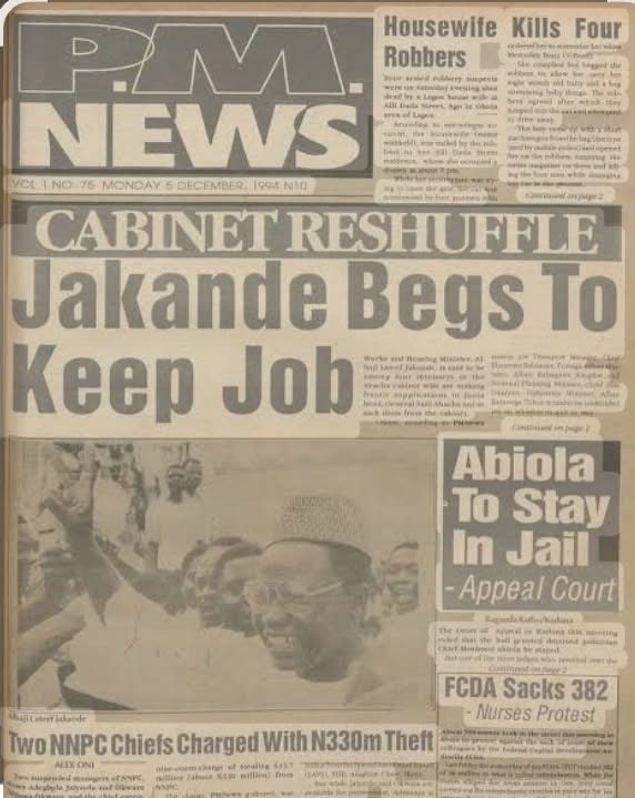 The front page of P.M. News published on Monday, December 5, 1994, captures the deep political and social unrest that defined Nigeria in the mid-1990s. During this period, the country was under the authoritarian rule of General Sani Abacha, whose government was marked by detentions, censorship, and public outrage.