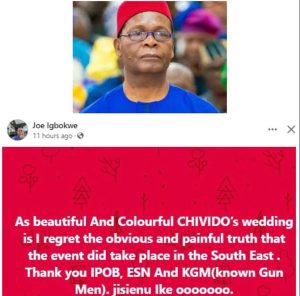 Blame and Insecurity: Ibokwe claims that the security situation in the South East, allegedly caused by IPOB, ESN, and “known gunmen,” made it impossible for the couple to hold their wedding in the region.