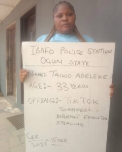 The Ogun State Police command has arrested Taiwo Adeleke, a suspected female cybercriminal notorious for using TikTok to allegedly defraud unsuspecting victims. Adeleke is accused of convincing victims of her fictitious social responsibility initiatives, only to defraud them of millions of naira.