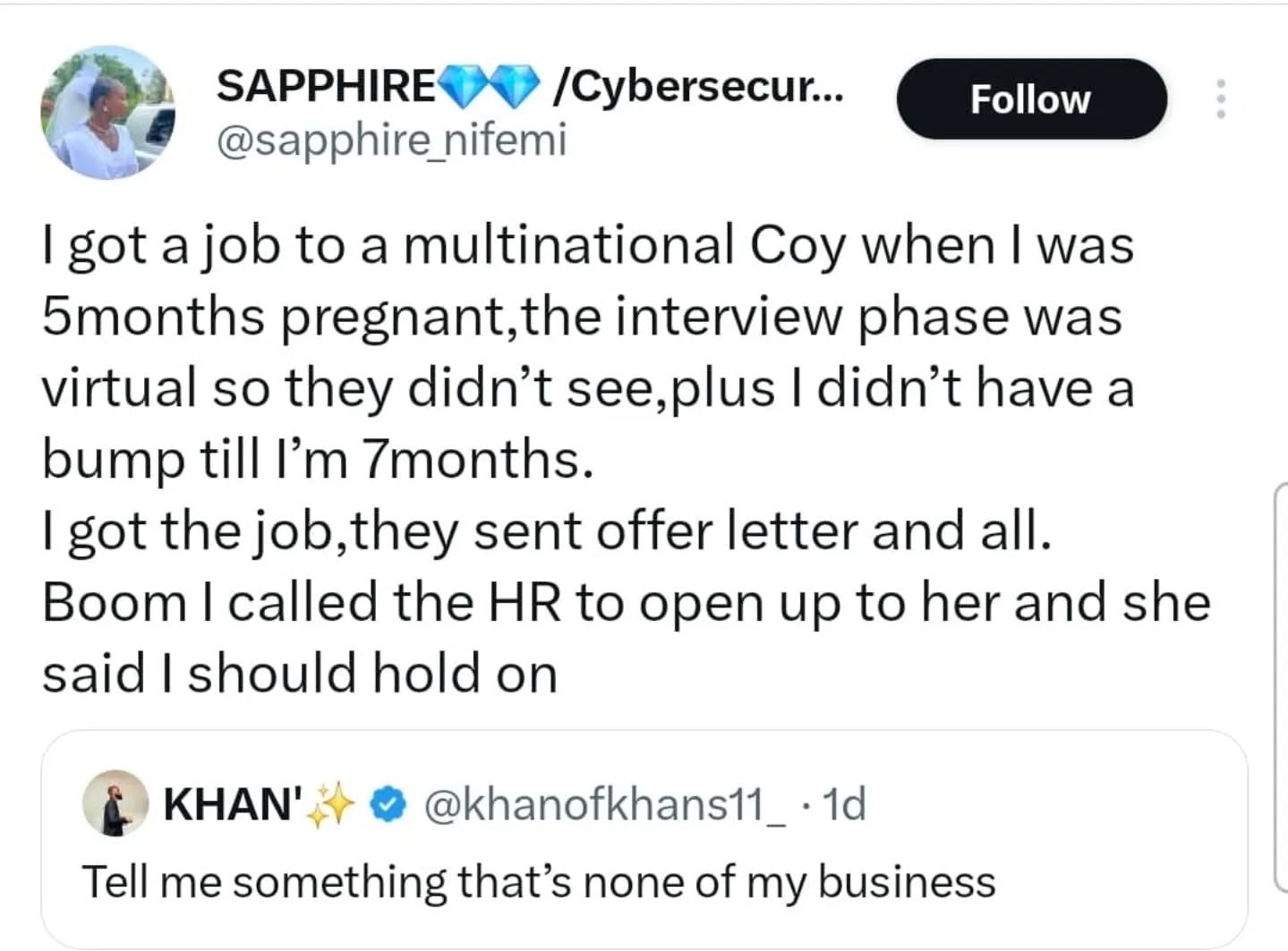 A Nigerian lady on X has gone viral after recounting how she lost a dream job offer the moment she informed the company that she was five months pregnant.