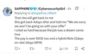 She wrote that she cried deeply because the role was a major breakthrough for her, paying over ₦500k with a hybrid structure — two days on-site and three days work-from-home.